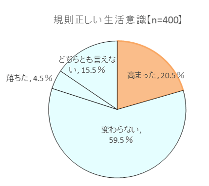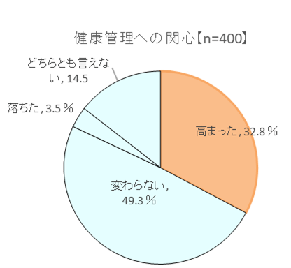 「コロナ禍を経て変化したことはありますか」という質問に対しては、「健康管理への関心」については32.8%の人が「高まった」と回答。また、30.5%の人が「免疫力が高まった」、20.5%の人が「規則正しい生活意識が高まった」としており、〝症状や行動″の変化よりも、〝意識や関心″の変化が大きかったことがうかがえます。