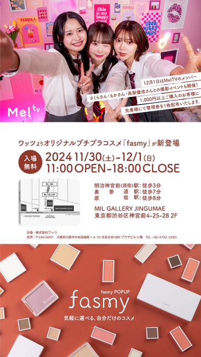 また、11月30日(土)より開催の<fasmy POPUP >にてMelTVのメンバーさくらさん・もかさん・高梨優佳さんとの撮影イベントを開催いたします。