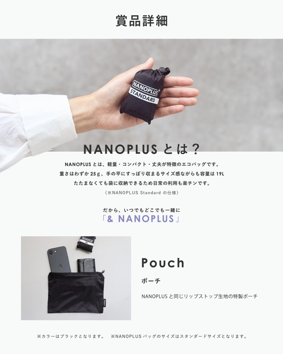 「NANOPLUS(ナノプラス)」は、軽量でコンパクトのバッグシリーズで「日用品のまとめ買いのために大容量のバッグを作って欲しい」という要望を受けたのがきっかけで開発されました。付属の袋に小さく折り畳み、横幅約7センチの小袋に収納できるのが特徴です。耐久性の高いリップストップナイロンを使用しており、この生地は縦横に太めの強化糸が格子状に配置され、軽量ながら丈夫です。スーパーでの買い物や普段使い、エコバッグを超えたファッションバッグなどとしても、幅広く利用することができます。