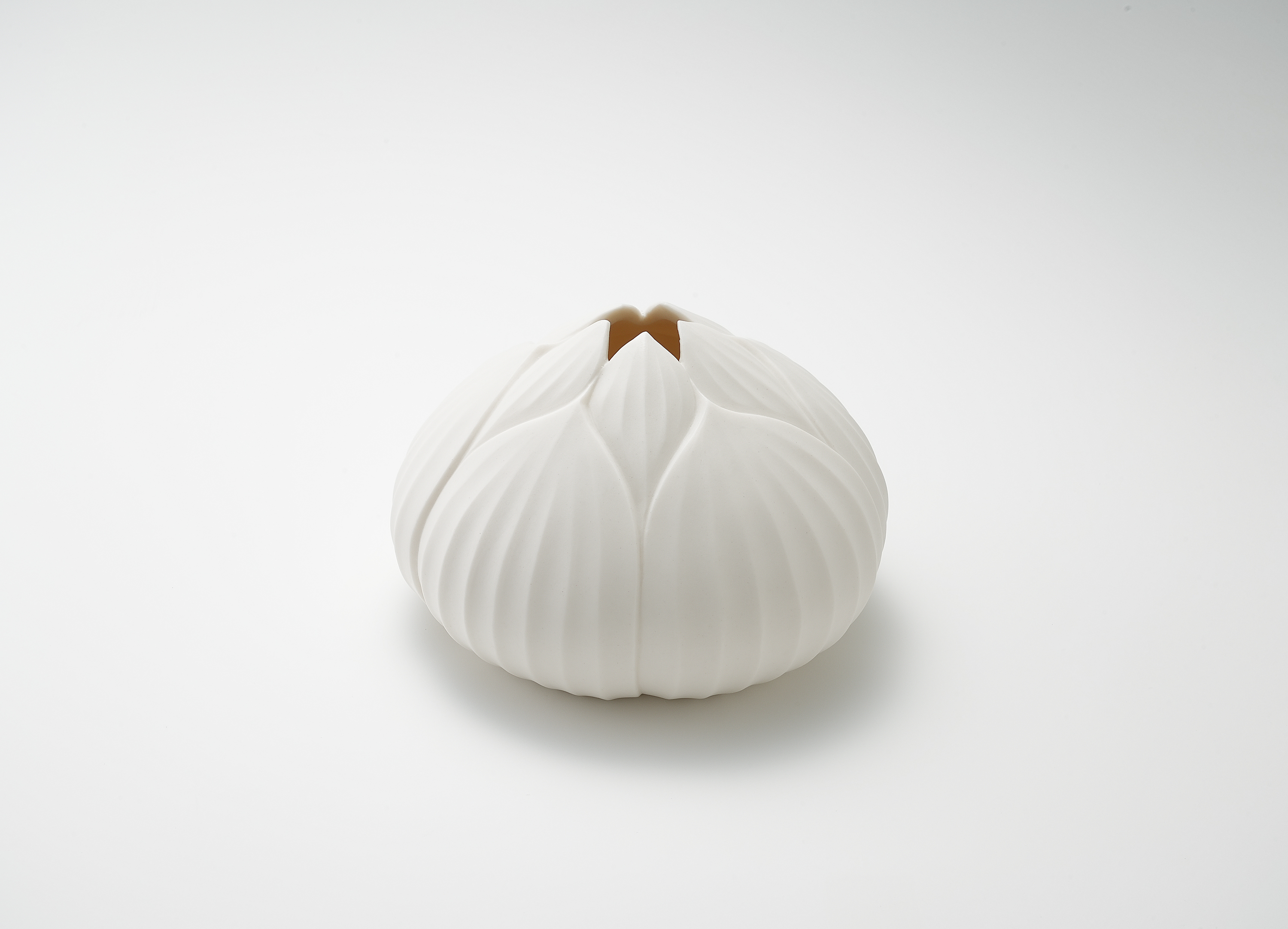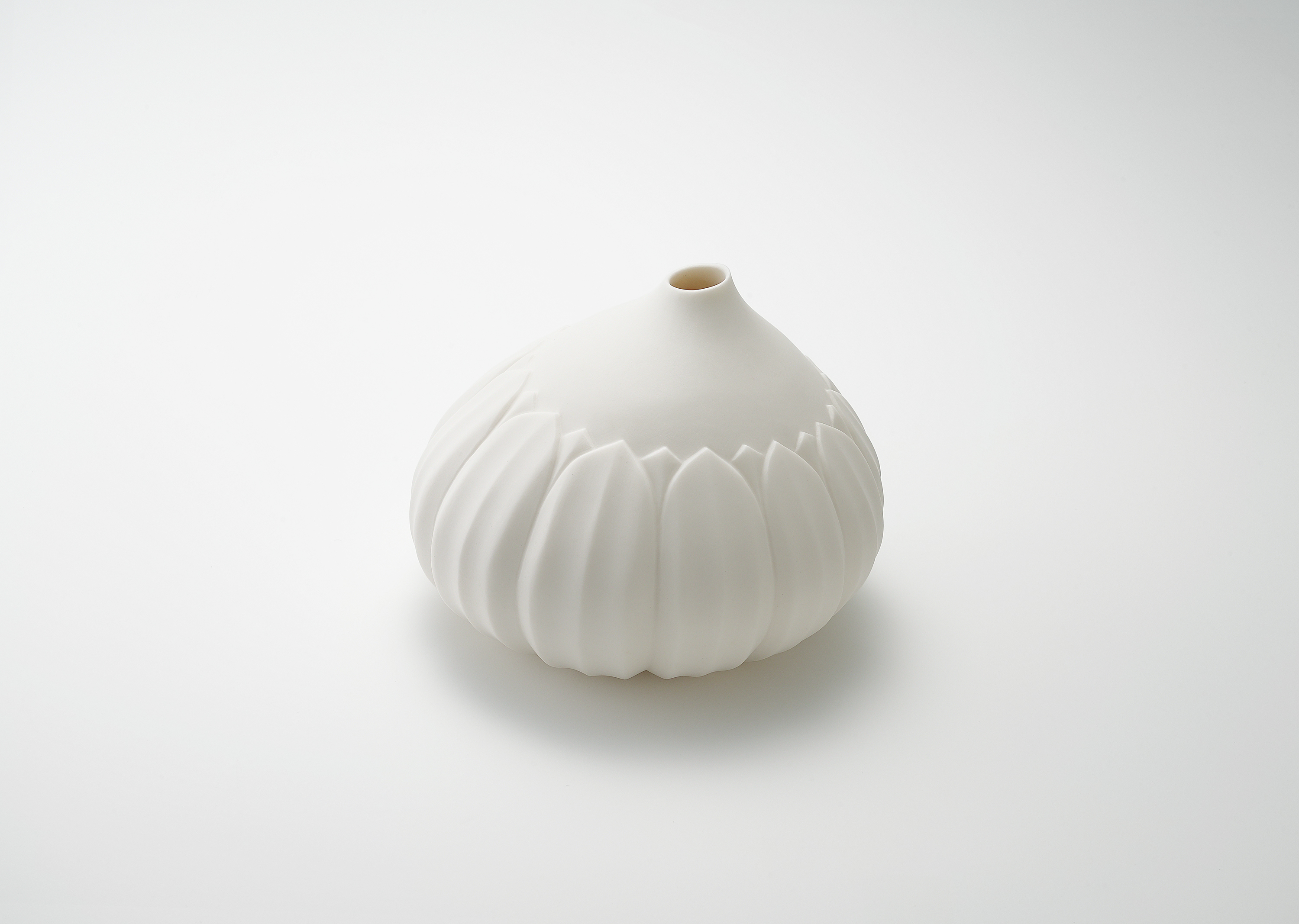今作について「自分が大切にしたいものを入れる特別な器としての存在であること、心の拠り所として寄り添える道具であることを目指して制作している」と語られています。白磁の陰影が生かされた柔らかなラインと、凛とした佇まいが神聖さを感じさせる作品をぜひご覧ください。