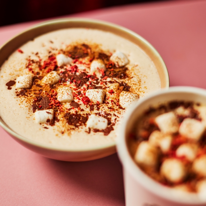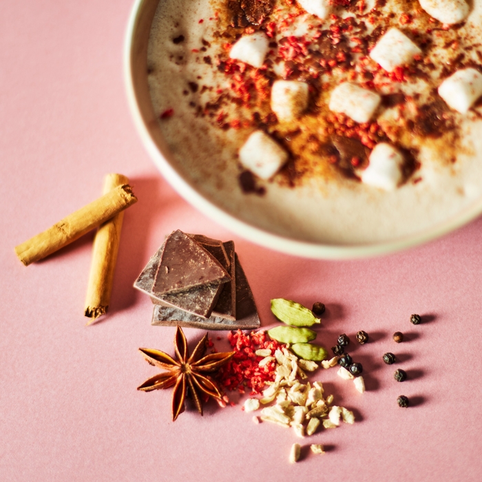 7種類のスパイスをブレンドしたカフェで人気のアッサムチャイにチョコレートを合わせ、マシュマロとドライストロベリーをトッピング。複雑に重なりあう奥深いスパイスの香りとチョコレートのまろやかな甘みが織りなす、身も心もほっこりとあたたまるスイーツドリンクです。