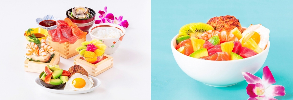 ▲「HONMAMON -ほんまもん-」の「南国セット(本まもん枡セット)」税込1,870円 枡や小皿など7品がセットで提供されるので(左)、自分の好みで豪華な丼に盛り付けることができる(右)