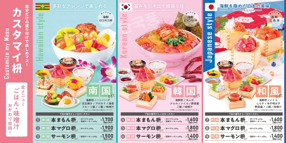 南国・韓国・和風の3セットをご用意。刺身の枡や小皿がセットで提供されるので、そのまま味わってもいいし、具材を大きな丼に盛り付けて豪華な丼に仕上げることもできる。食べ方は自由自在。さらに刺身は、本マグロだけ、国産サーモンだけにすることも可能。“自分流にカスタマイズ”するのが楽しいランチ。