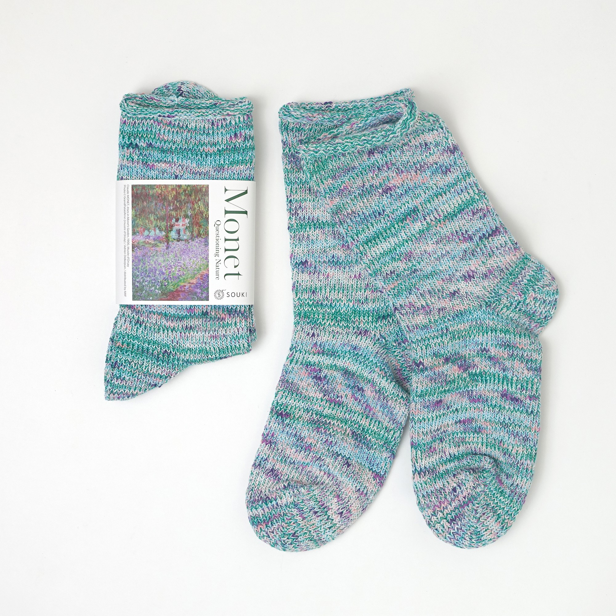 本商品は、モネの代表作である「日傘の女」、「モネの庭」をモチーフに制作しました。「日傘の女」をイメージしたソックスでは、草原を渡る光と風の中に、そっと溶け込む女性の佇まいを。「モネの庭」をイメージしたソックスでは、花や葉、土、水、そして光が重なり合う、庭の豊かな気配を表現しています。SOUKIが得意とするローゲージ編みにより、絣染めの糸で、複数色が混ざり合う色の奥行きと、ぷくぷくとした立体感を生み出し、モネの描いた“光と色の揺らぎ”を足元へと落とし込みました。
