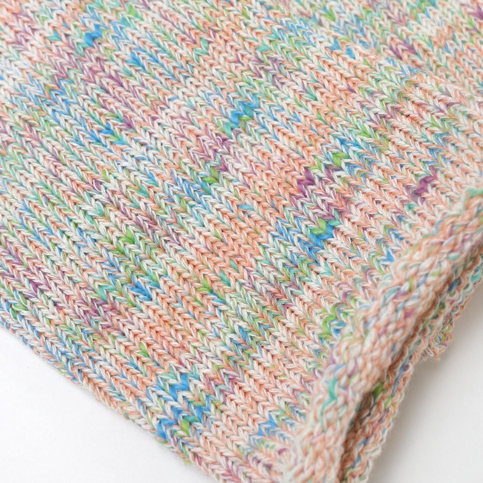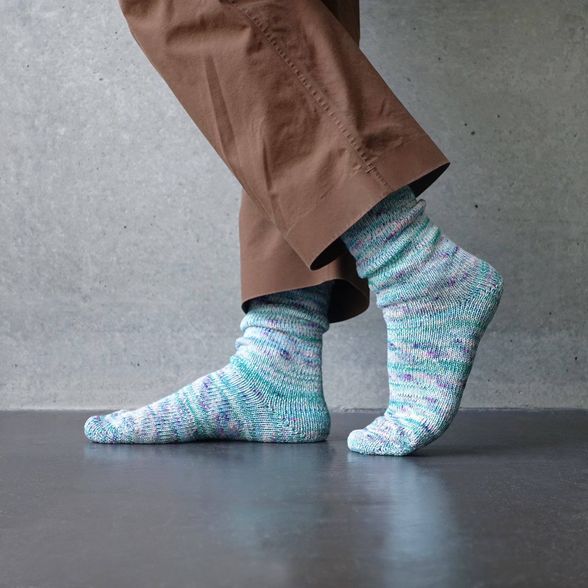 素材には、綿のやわらかさ、和紙のさらりとした清涼感、シルクのしっとりとした上質な肌触りを組み合わせています。また、本商品は、自転車を漕ぐ力で靴下を編む「チャリックス(CHARICKS)」にも使用されている、希少なヴィンテージの靴下編機で製作。素材の魅力を最大限に引き出しながら、一足一足、丁寧に編み上げています。編み機の特性上、色の出方や表情は一足ごとに異なり、すべてが一点もののような存在となります。