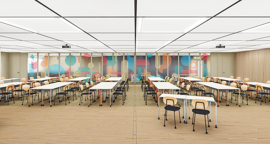 スライディングウォールを使用し、3つのスペースに区切ることができるほか、1人用の机を自由に組み合わせ、多様なコラボレーションが可能です。