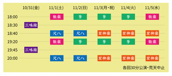 【内容】能楽、里神楽、尺八、三味線、箏の伝統芸能の公演を、各日2組の演者(10月31日のみ1組)が日替わりで行います。