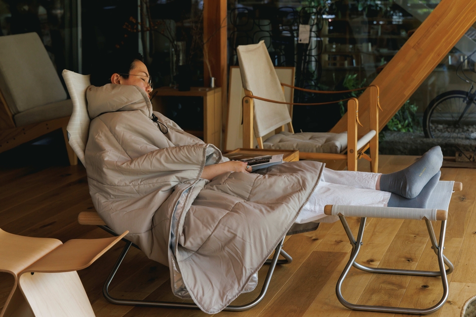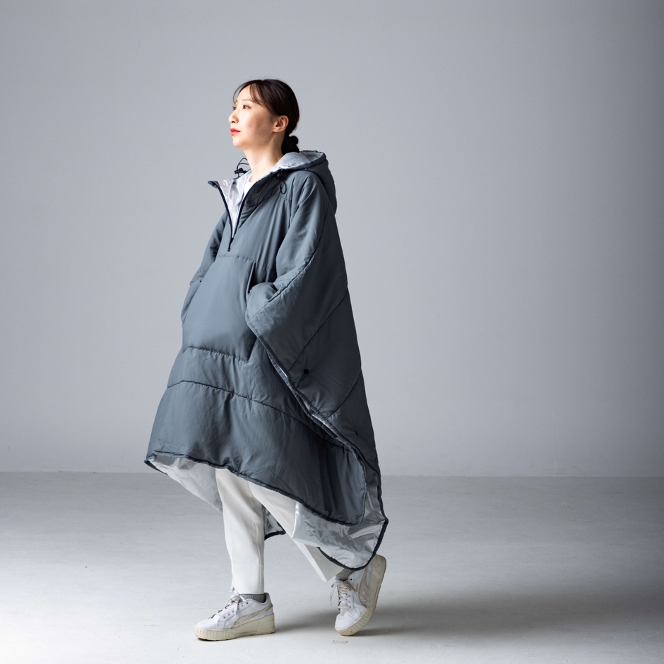 ポンチョ型の本製品はサイドにボタンがあり、はずして広げると横140cm×縦195cmのシンプルな長方形に。可動域の広い形なので肩が凝りにくく、動きやすい。さらに広げればブランケットのように使うこともできます。