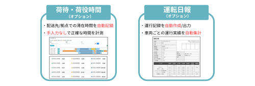 ・稼働管理オプションサービス(荷待・荷役時間、運転日報)は別途、月額利用料300円/台でご利用いただけます。