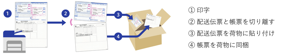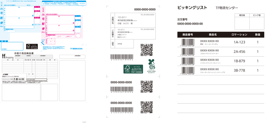 パターンタックフォームは、部分的(あるいは全面)に粘着面を持ち、帳票(納品書やピッキングリストなど)と一体化している配送伝票では宛先と帳票部分を同時に印字でき、マッチング作業が不要になります。