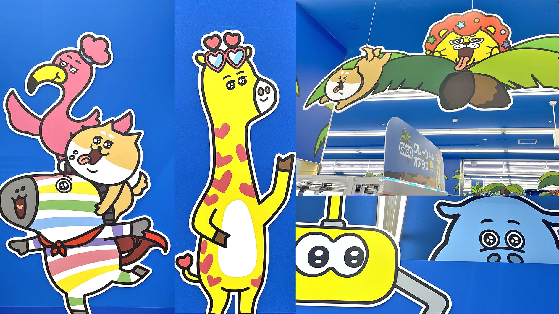 施設全体にはクレーンゲームをより身近に、より楽しくしてくれるGiGOクレーンゲームオアシスのオリジナルキャラクターがデザインされています。リーダーのライオン「ぎごまる」をはじめ、カバ、シマウマなど、動物をモチーフにした個性豊かなキャラクターが空間を華やかに彩ります。