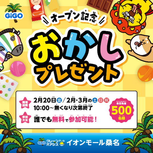 「GiGOクレーンゲームオアシス イオンモール桑名」のオープンを記念して、様々なイベントを開催いたします。参加はすべて無料です。お気軽にご参加ください。