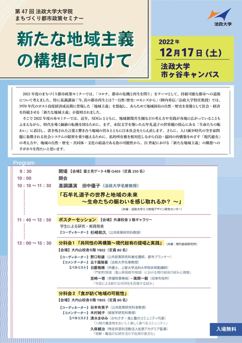 法政大学大学院は、12月17日(土)に第47回まちづくり都市政策セミナー「新たな地域主義の構想に向けて」を開催します。(参加費無料、事前申込制)