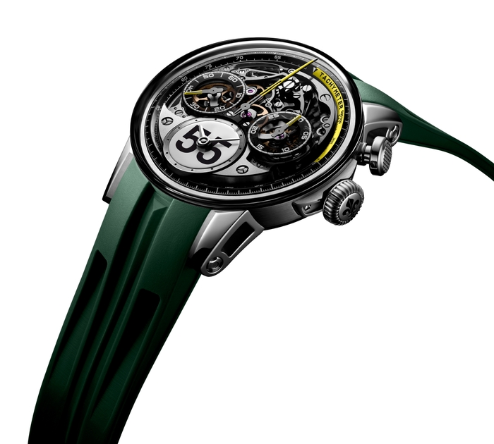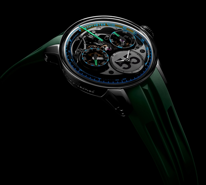 レーシングカーに用いられる、空気の流れをコントロールするエアロダイナミクスの技術を、時計全体のフォルムに取り入れています。これにより、表面の触り心地や装着感を高めています。ラグは横方向にくり抜かれたオープンワーク仕様になっており、ラバーストラップはケースとぴったり合うように特別にデザインされています。暗所では、秒針・クロノグラフ秒針・30分積算針・フランジの目盛りが、スピードメーターのように発光し、視認性を確保します。
