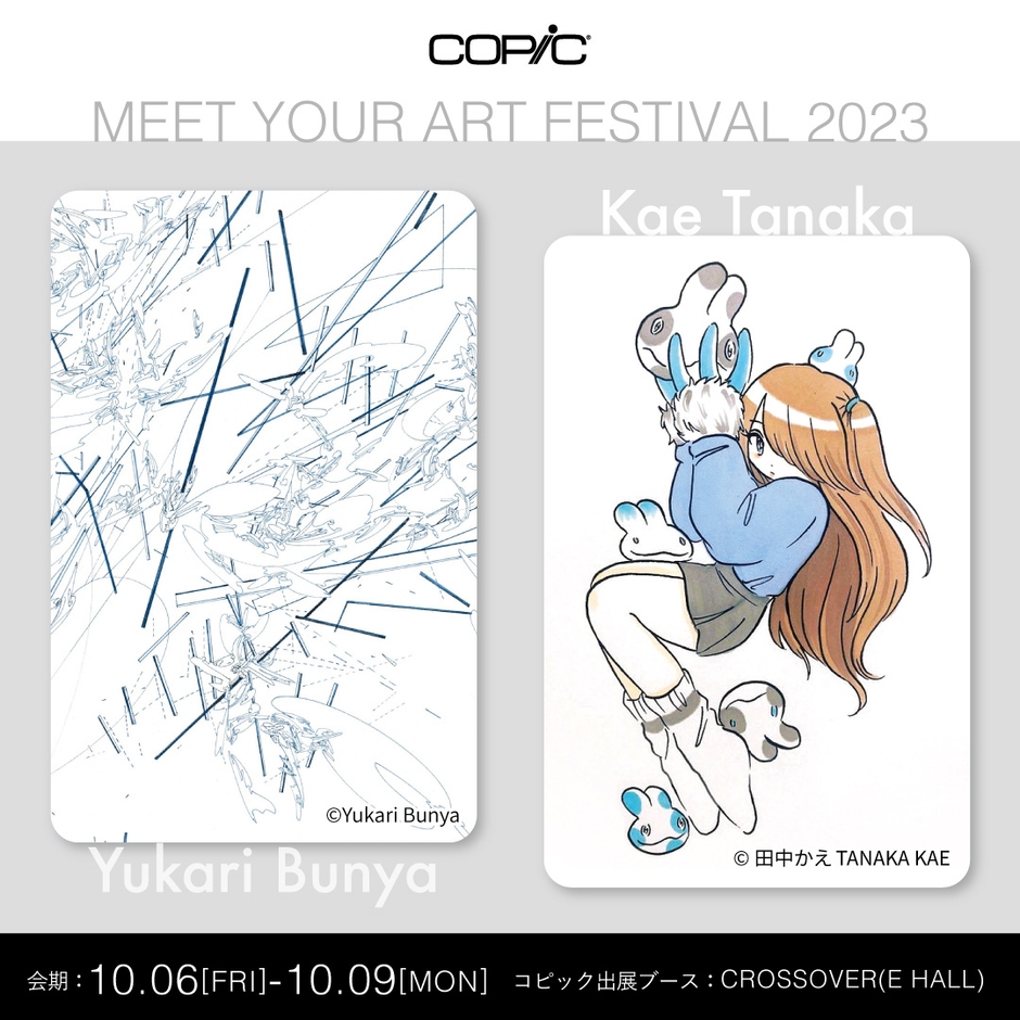 コピックはMEET YOUR ART FESTIVAL内、アートと様々なカルチャーが交差する風景をそれぞれの視点で切り取るアートフェア「CROSSOVER」(会場:E HALL) へ出展し、コピックを用いて制作活動をしているアーティスト・田中かえ、コピックマルチライナーを用いた繊細な作風が特徴のアーティスト・文谷有佳里の2名の作品展示、販売と、コピック製品・田中かえのステッカーグッズ販売を行います。