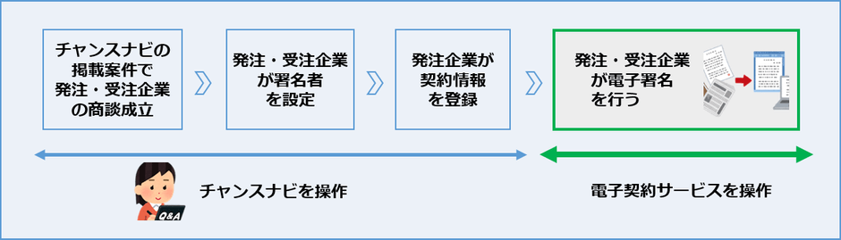 ビジネスチャンス・ナビ上に案件を掲載した発注企業と、エントリーを行った受注企業との契約締結に、本システムが提供する電子契約サービス(※)を利用することができます。