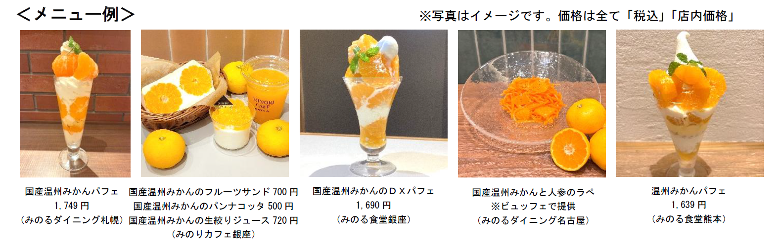 フェアでは、出荷最盛期を迎える、酸味が和らぎ濃厚な甘さが特長の温州みかんをふんだん使用したオリジナルスイーツを各店舗で提供します。