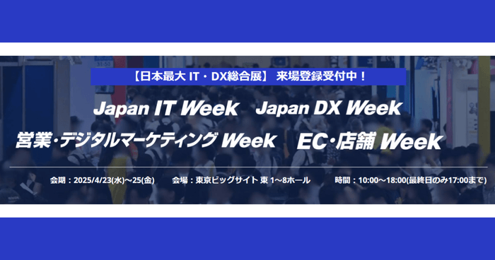 【Japan IT Week】【Japan DX Week】【営業・デジタルマーケティング Week】【EC・店舗 Week】の4つの展示会で構成される、日本最大のIT・DX総合展です。日本全国をはじめ、世界各国から来場者が訪れ、ビジネスマッチングが行われています。
