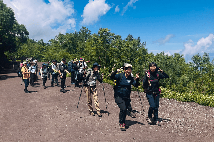参加者はふじさんミュージアムや御師の家などを訪ねて富士山信仰について学習。西湖、精進湖、本栖湖が見渡せる三湖台から青木ヶ原樹海を眺望したり、溶岩洞穴では氷筍を見たりして悠久の自然に触れた後、登山に挑戦しました。
