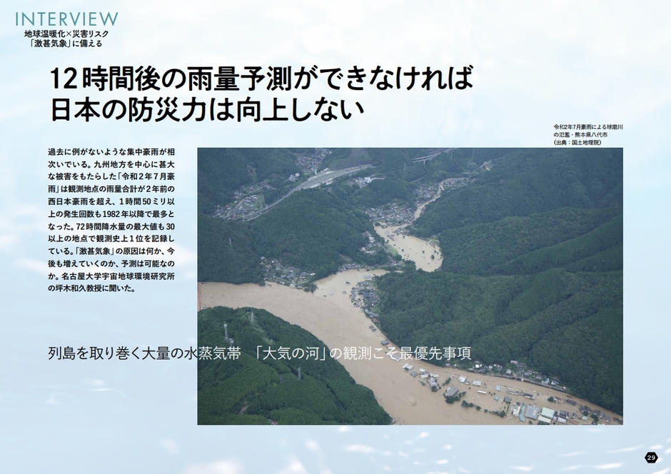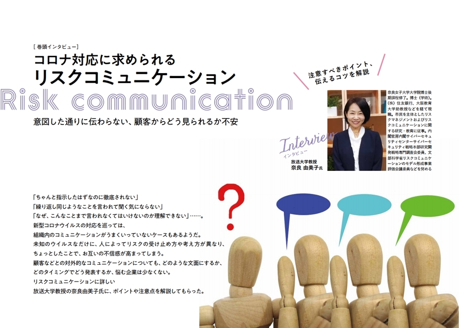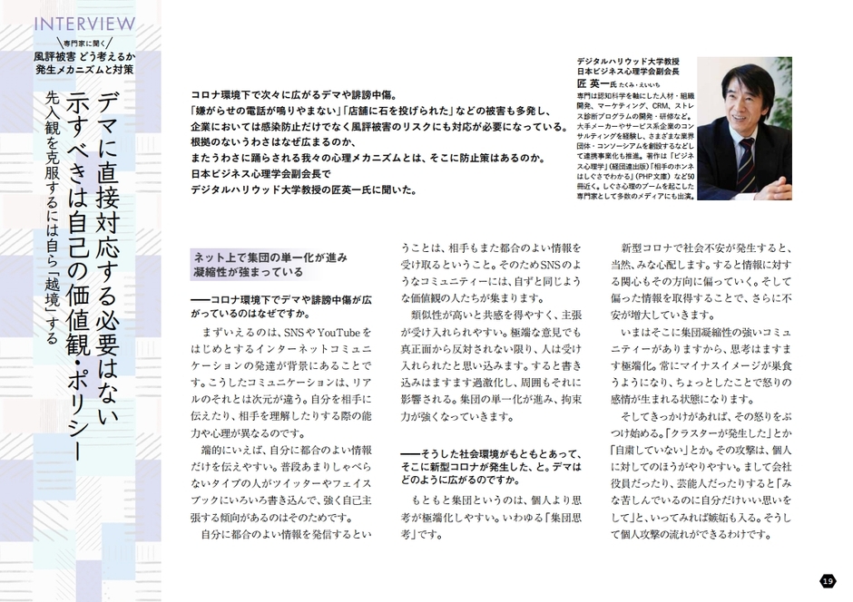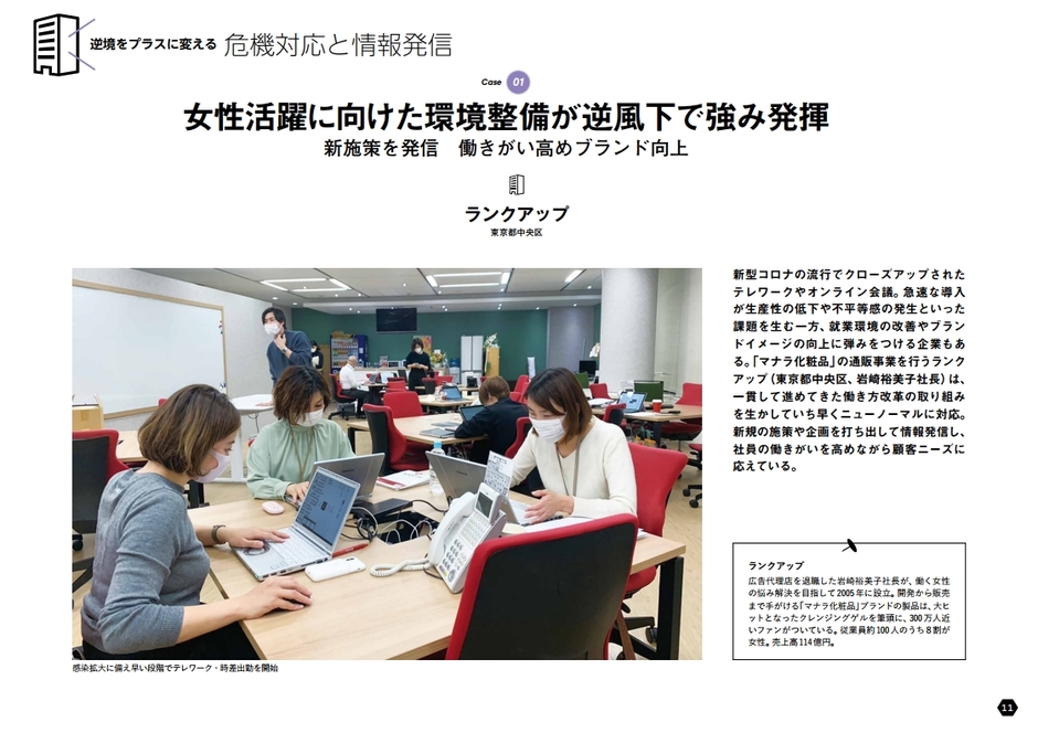 設立以降一貫して進めてきた働き方改革の取り組みを生かしていち早くニューノーマルに対応したランクアップ(東京都)、風評被害を受けながらも自社の考えを前向きに発信することで信頼を向上させた小林創建(長野県)を取材。コロナ環境下で打ち出した新規の施策や企画、広報に込められたメッセージを紹介します。また専門家インタビューを通じ、コロナ対応に求められるリスクコミュニケーションの基礎知識から、企業がデマや誹謗中傷を受けた場合の対策までを解説。さらに、過去に例のないような豪雨が頻発していることを受け、気象予測技術のこれからを名古屋大学宇宙地球環境研究所の坪木和久教授に語ってもらいました。