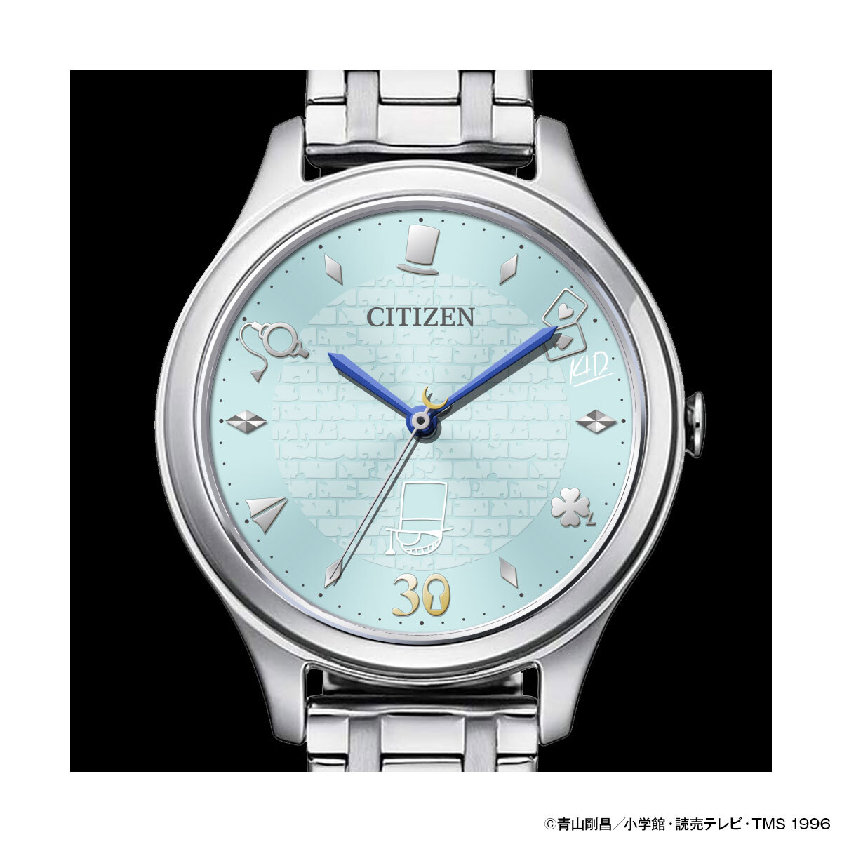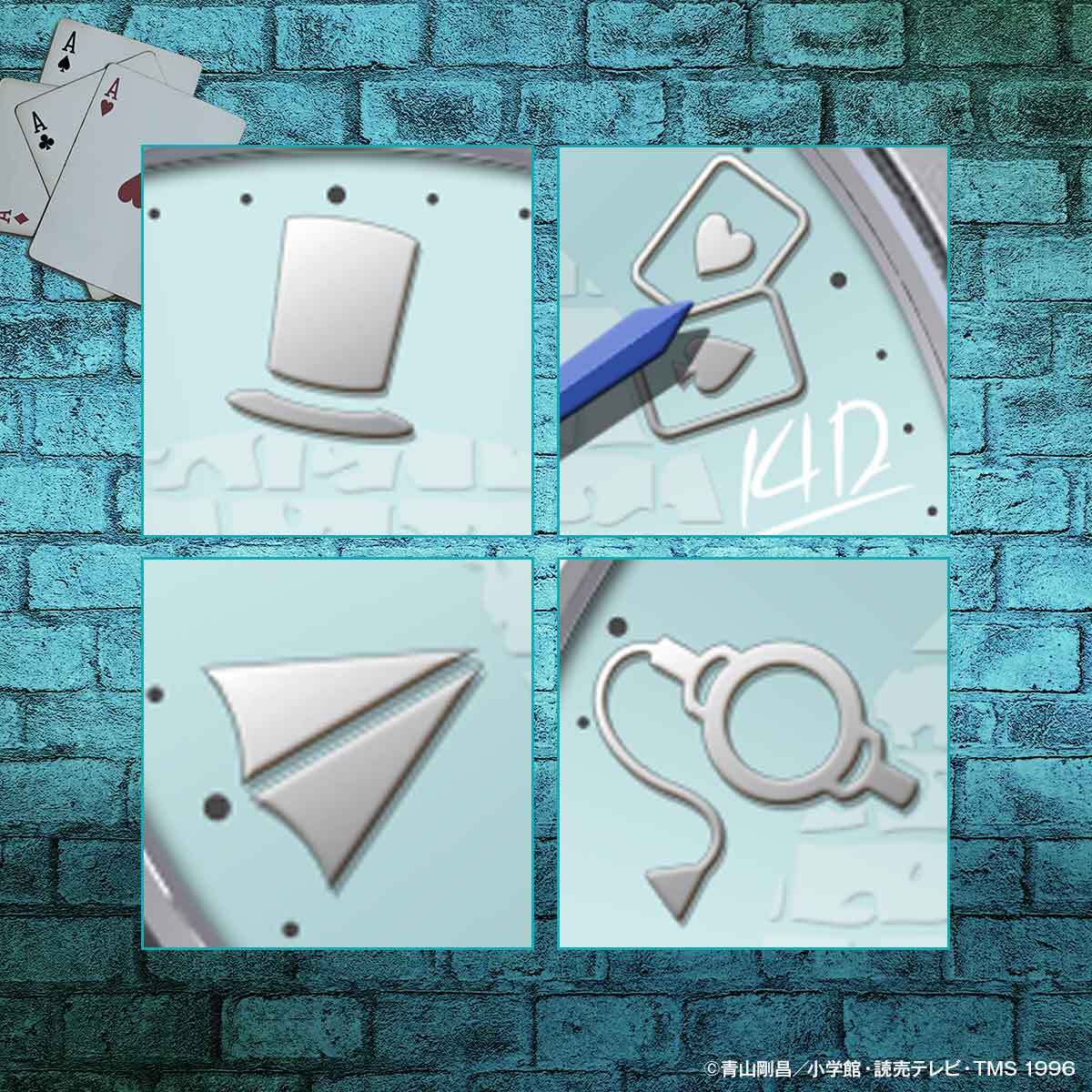 文字盤の色は夜空を翔ける怪盗キッドをイメージした月光のペールブルー。レンガ模様の陰影とキッドを象徴するアイテムが印象的。