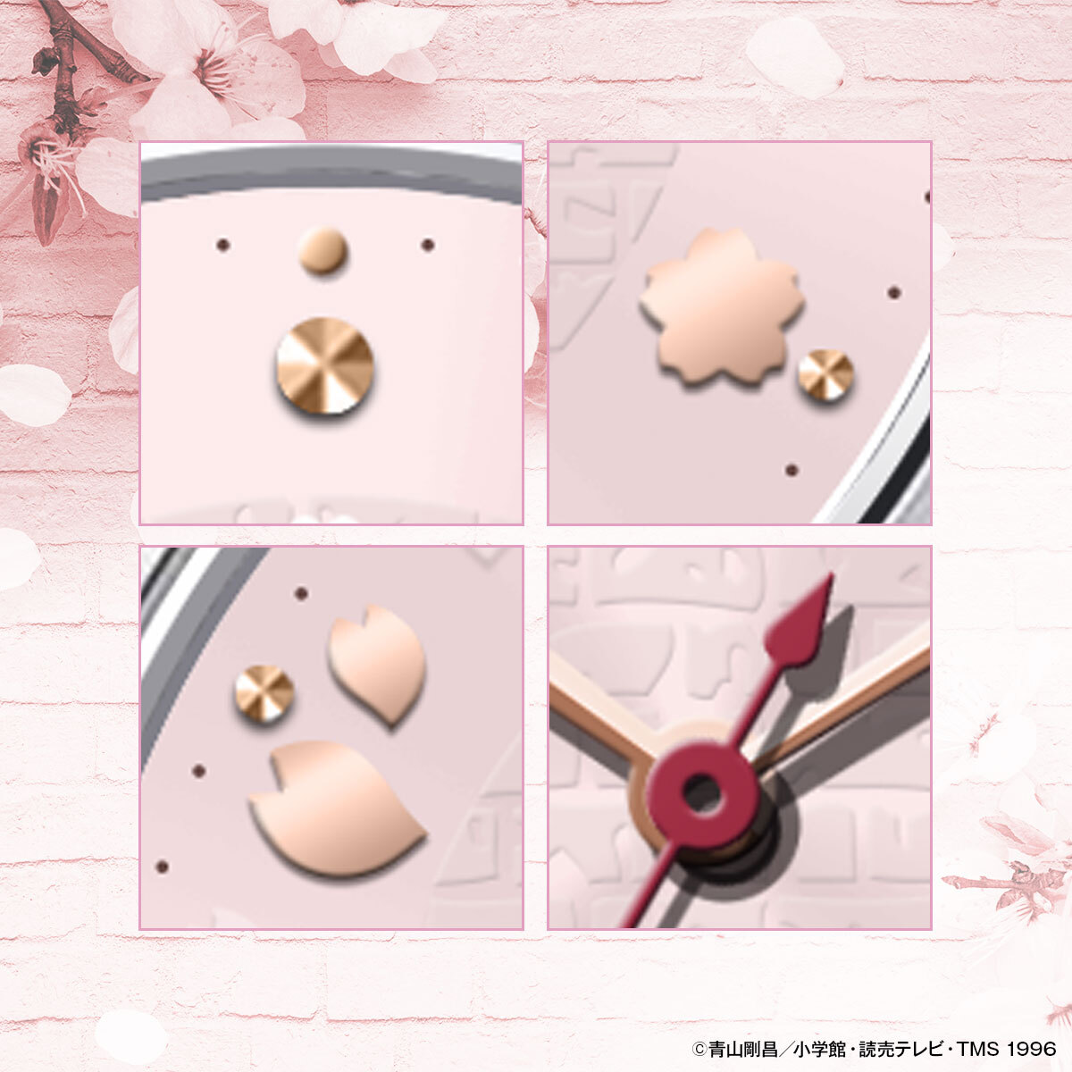 新一と遊んだ幼い日の記憶を呼び覚ます淡いサクラ色の文字盤。レンガの壁を背景に、桜の花びらとハートが舞うフェミニンなテイスト。