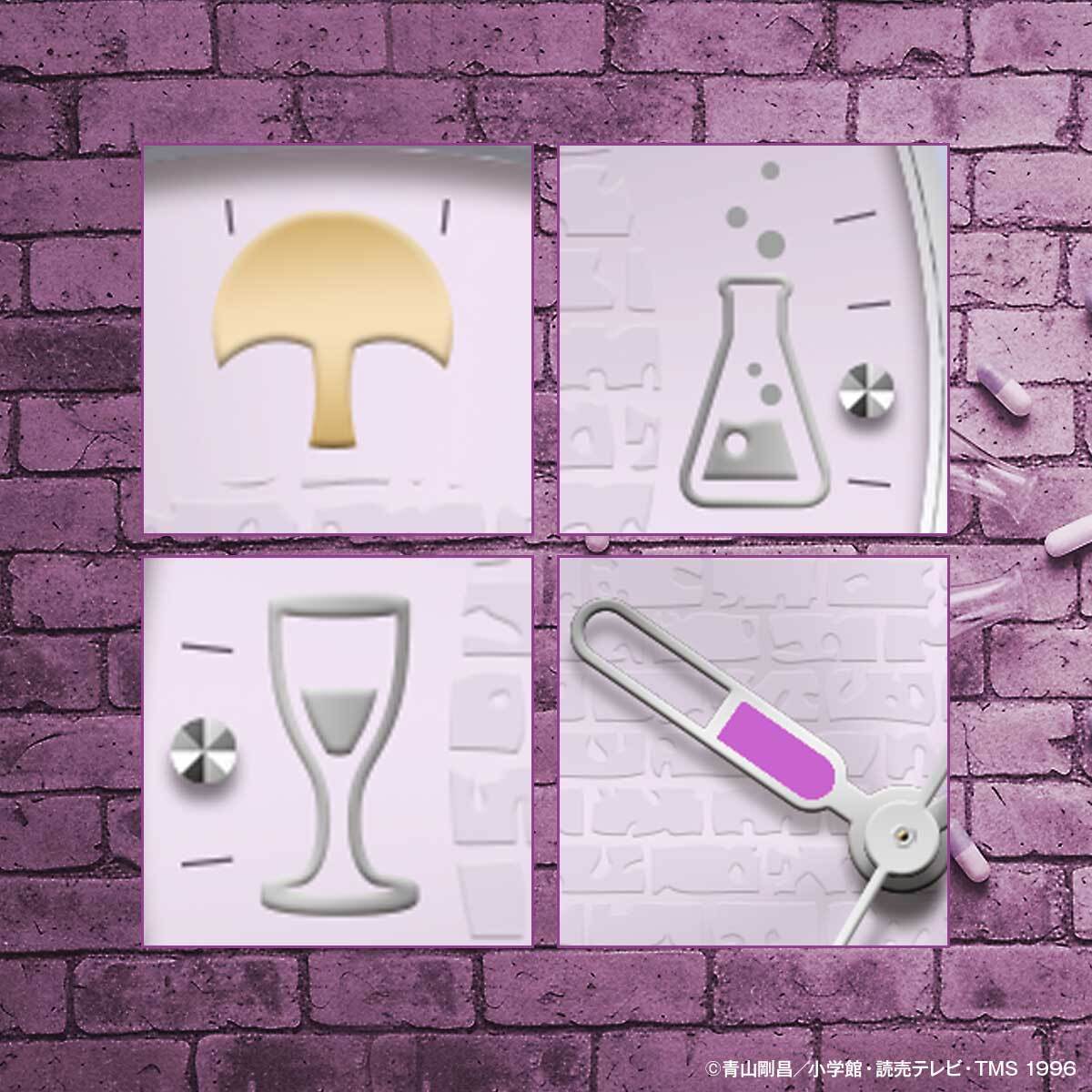 蝶ネクタイ型変声機、腕時計型麻酔銃、メガネをインデックスにデザイン。秒針には探求心を象徴する金色のルーペ。