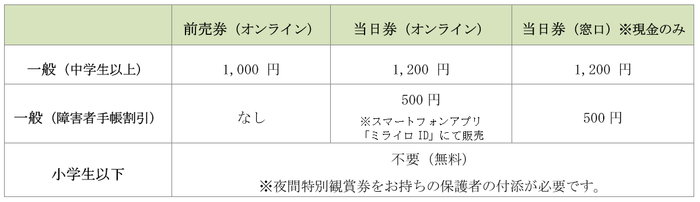 ※小学生以下のお子様は無料でご入場可能です。(夜間特別観賞券をお持ちの保護者の付添が必要)