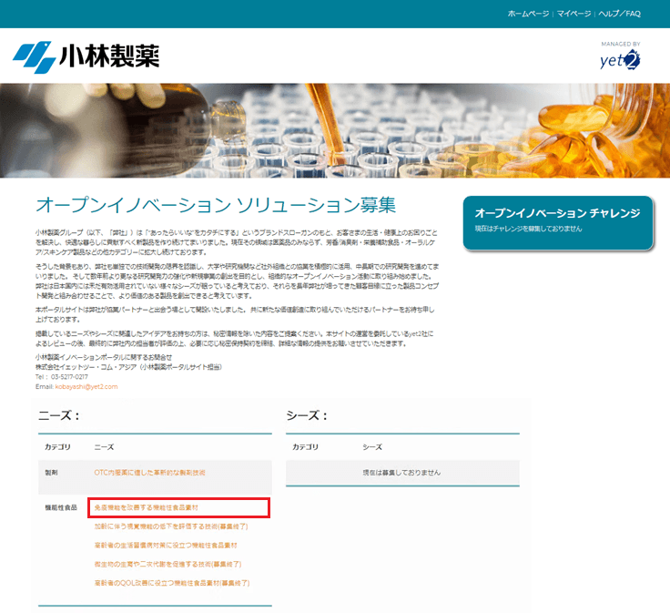 詳細は小林製薬オープンイノベーションポータルサイト( http://kobayashi.yet2.com )より『免疫機能を改善する機能性食品素材』ニーズをご覧ください。