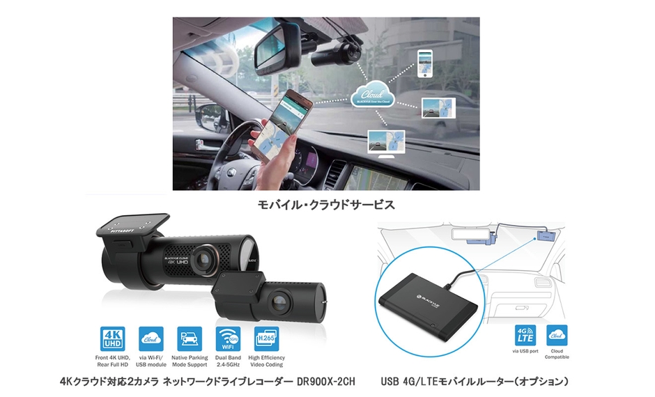 ドライブレコーダーは運転者の安心、安全に必要な製品として多くの方々から認識され広く普及しましたが、今後は5G/4GモバイルネットワークとIT技術を活用することにより更に安全、安心、便利な機能を提供するモバイル・クラウドサービス対応を期待されています。このため国内初USB外付け4G/LTEモバイルルーター(オプション)接続可能なクラウド対応ネットワークドライブレコーダーの販売に至りました。