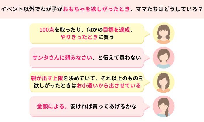 今回のアンケートでは、多くの家庭が「ご褒美」や「特別なタイミング」に応じておもちゃなどの欲しがっているものを購入していることが明らかになりました。