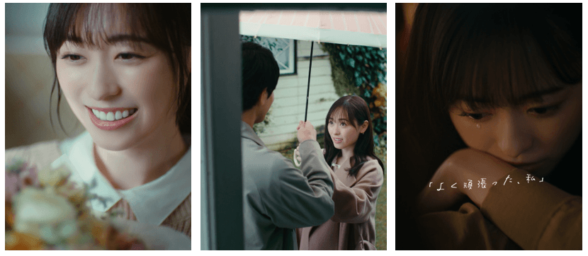 本動画は全3本立てとなっており、「まるでスイーツのような感情をひとつひとつ味わう」というコンセプトのもと、福原さんが恋愛の「甘い」、「甘酸っぱい」、「ほろ苦い」の3つの瞬間をテーマに恋の移ろいを表現しました。男性からサプライズで花束をプレゼントしてもらい、照れながらも幸せそうな笑顔を見せる福原さんや、相合傘にキュンキュンする姿、失恋してしまい涙を流す様子など、恋の移ろいの一瞬の表情の変化を描きました。恋する女の子の様々な表情を見事に演じ分けた福原さんの表情の変化は必見です。