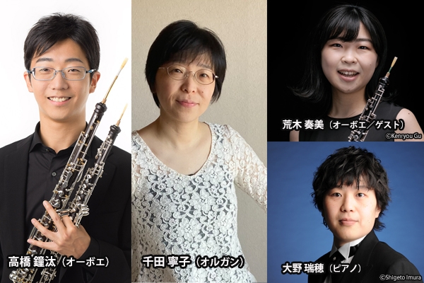 出演は、「第12回 国際オーボエコンクール・東京」奨励賞を受賞した高橋鐘汰(オーボエ)と、「第8回武蔵野市国際オルガンコンクール」第4位(日本人最高位)と聴衆賞を受賞した千田寧子(オルガン)、そしてピアニストの大野瑞穂。ゲストとして、「第11回 国際オーボエコンクール・軽井沢」にて日本人で初めて第1位[大賀賞]を受賞した荒木奏美(オーボエ)も出演いたします。オーボエおよびオルガンの旬でハイレベルな演奏をお届けするほか、オーボエとオルガンによるコラボレーション曲の演奏も予定しています。