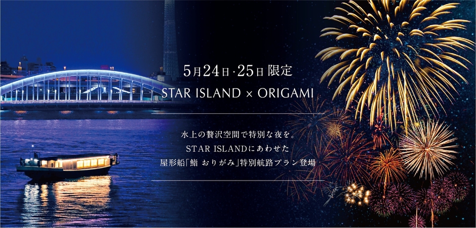 東京で江戸時代から続く屋形船文化と江戸前鮨を融合させた、8席限定の完全予約制屋形船「鮨 おりがみ」は、東京・お台場で開催される水上花火と音楽の祭典「STAR ISLAND」にあわせて、2025年5月24日(土)・25日(日)の2日間限定で特別航路プランを提供いたします。