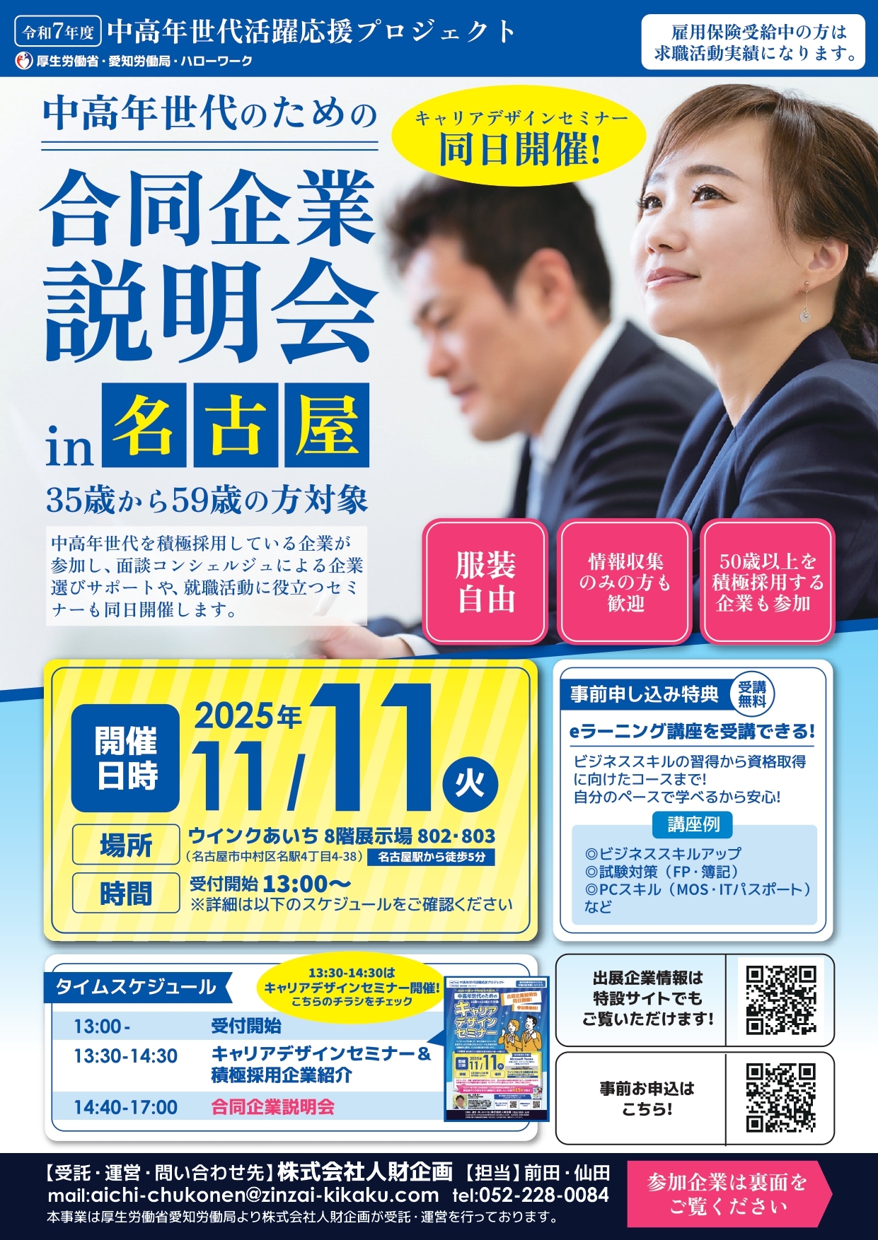 株式会社人財企画は、「令和7年度中高年世代活躍応援プロジェクト」(厚生労働省愛知労働局)の受託事業として、2025年11月11日(火)、名古屋市・ウインクあいちにて「中高年世代のためのキャリアデザインセミナー」と「中高年世代のための合同企業説明会 in 名古屋」を同日開催いたします。