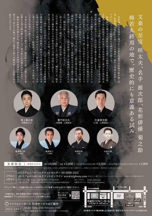 菊五郎家と墨田区との縁の深い歌舞伎界を代表する花形俳優、尾上菊之助(立方)が、「梅若丸の母」を演じます。能楽の囃子方大倉流小鼓方宗家の大倉源次郎(人間国宝)とともに、文楽の至宝、豊竹咲太夫(人間国宝)が、深い作品解釈と卓越した精緻な語りで、愛するわが子を探し求めて狂女となる母親の悲劇を描き出します。