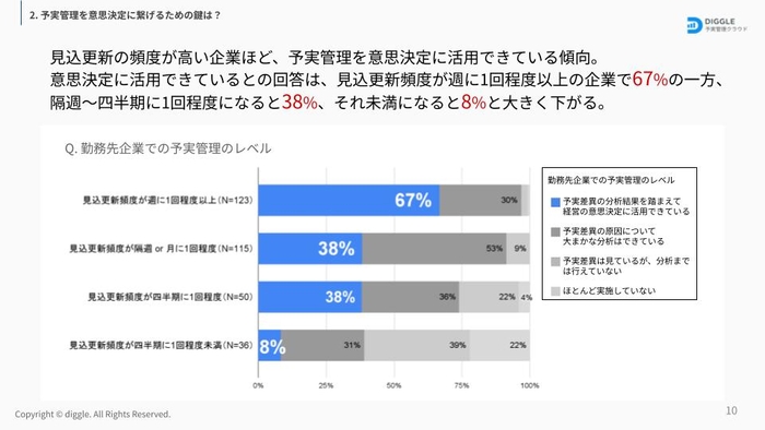 勤務先企業での予実管理のレベルについて、見込更新の頻度別で分類を行うと、予実差異の分析結果を経営の意思決定に活用できていると答えた割合は、見込更新が週1回程度以上の企業で67%、隔週〜四半期に1回程度の企業で38%、四半期未満の企業で8%という結果となった。見込更新の頻度が高いほど予実管理を意思決定に活用できていると言える。また予実管理を意思決定に活用するためには、財務指標やKPIなどの数値見込の更新頻度を週1回程度以上行うことが有用だと推測される。