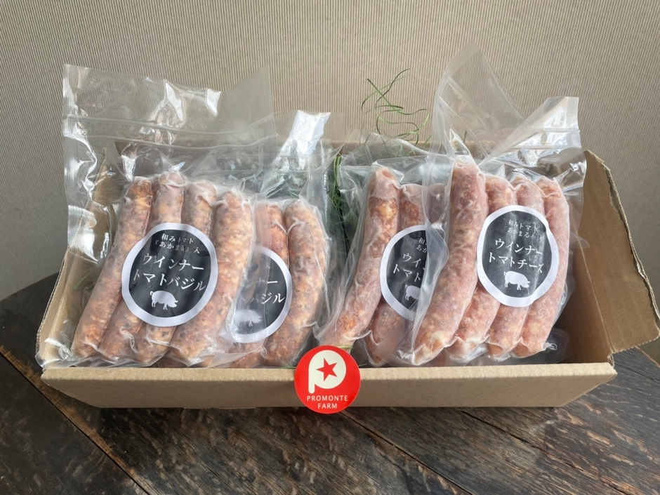 商品開発中に、「和みトマトあかまる-akamaru-」の味をより引き立たせるため、バジルとチーズとガーリックを使用し、オリジナルウインナーを完成させました。現在は3種ともプロモンテファームの直売所で販売中です。