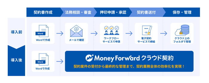 『マネーフォワード クラウド契約』は、契約書についての法務相談から作成、申請・承認、契約締結、保存、管理までクラウド上で完結できる電子契約・契約書管理サービスです。紙の契約書を発行する際に必要な印刷・製本・押印・郵送などの手間や時間、コストを削減できるだけでなく、紙の契約書や複数の電子契約サービスで締結した契約書の一元管理を実現します。また、契約データを債務管理や人事管理に連携させることで、契約書管理にまつわる業務を効率化し、バックオフィス全体の生産性向上を実現します。
