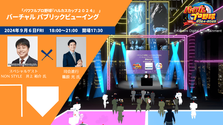 メタバースを活用することで、場所・デバイスを問わずどこからでも手軽に参加でき、場面に合わせた心躍る演出などの楽しみ方を体感いただけます。また、スペシャルゲストとして吉本興業所属のお笑い芸人 NON STYLE 井上裕介氏を起用し、「バーチャルパブリックビューイング」観戦者と一体となって盛り上げます。