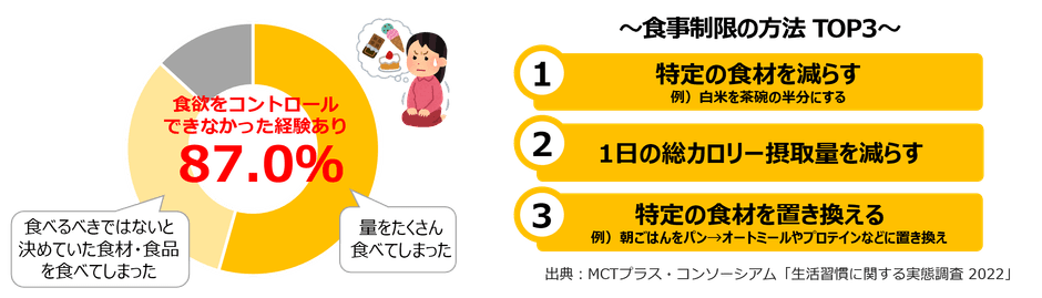 調査結果によると、食事制限ダイエット経験者のうち87.0%の人が「食欲をコントロールできなかった経験がある」と判明。おかわりなどで量をたくさん食べてしまったり、自分で食べないとルールを決めていたにもかかわらずその食品を食べてしまったりと、我慢と誘惑との戦いに負けてしまうダイエッターが続出している実態が明らかになりました。