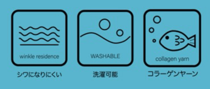 養殖漁業が盛んな東アジアでは食品用に大量の魚が養殖されています。それと同時に、魚を食品へ加工する際には大量の廃棄物が発生します。コラーゲンヤーンはその廃棄物となる鱗を再利用する製造方法で作られている生地です。鱗からコラーゲンペプチドアミノ酸を抽出し、ポリマーと分子レベルで結合させ、コラーゲン成分を含んだポリマーからポリエステルの糸を作ります。その糸は通常のポリエステルより柔らかく仕上がり、肌に馴染むうえ、洗えてシワになりにくく仕上がります。