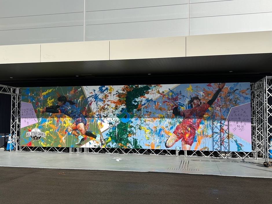 本イベントは、SVリーグ初のオールスターゲームとして開催され、2日間で合計5,225名もの観客が来場しました。秋山氏が手がけた壁画は、2.4m×9mの壁面にペンキやアクリル絵具などを用いて描かれたもので、出場選手全員のサインが入った貴重な作品となっています。