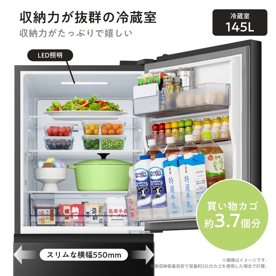 大容量のドアポケットや出し入れしやすい2段式冷凍室、使い勝手の良い真ん中配置の野菜室など、限られた設置スペースでも高い収納力を発揮。冷凍食品やまとめ買いのニーズに応えつつ、省エネ・静音性にも配慮した一台です。住まいに合わせて選べるブラック&ホワイトの2色展開で、快適なキッチン空間を実現します。