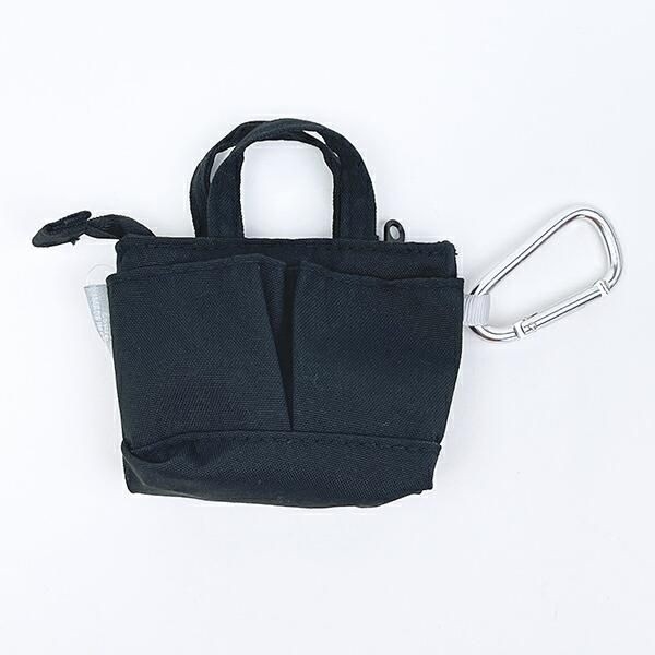 ミニサイズのトートバッグのような見た目がチャーミングすぎる。内側にDカンが付いているので鍵も付けられて、見た目以上にとっても便利です。正面1か所、背面2か所のポケット付きで、リップクリームや目薬など小物を収納するのにぴったりです。カラビナ付きなので、バッグに付けておくと便利です。サイズ:12cm×11cm×4.5cm 素材:ポリエステル