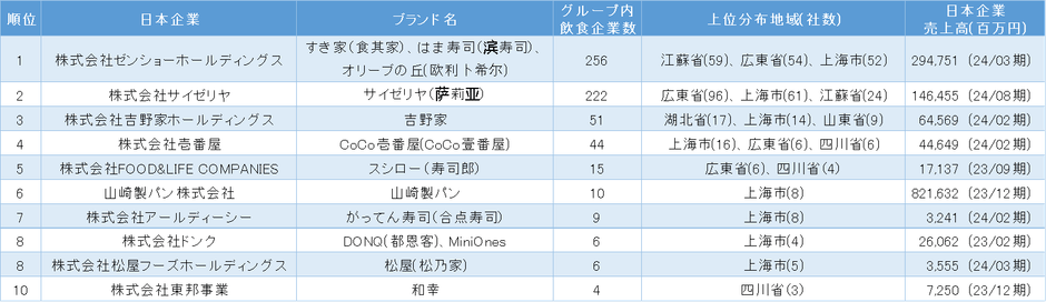 中国の日系飲食業を日本の親会社と紐付けた企業数でランキングを作成した結果、1位「ゼンショーホールディングス」(256社)、2位「サイゼリヤ」(222社)、3位「吉野家ホールディングス」(51社)、4位「壱番屋」(44社)となりました。(表1)