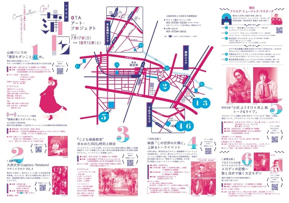 「OTAアート・プロジェクト」は、“アートでまちづくり”をテーマに大田区に点在する様々な文化芸術に関わるヒト・モノ・コトを資源として紹介し、未来に向けて新たに共創していくための創造プロジェクトです。2022年度は、蒲田に残る映画や音楽などの歴史的文化資源を、新たな付加価値と共に紹介する企画「蒲田★今昔物語」を実施します。
