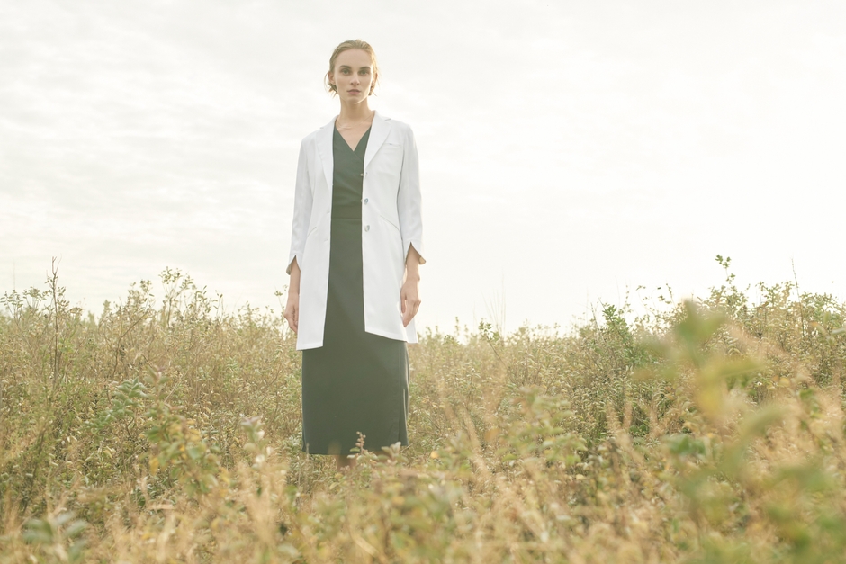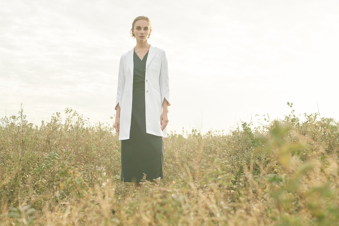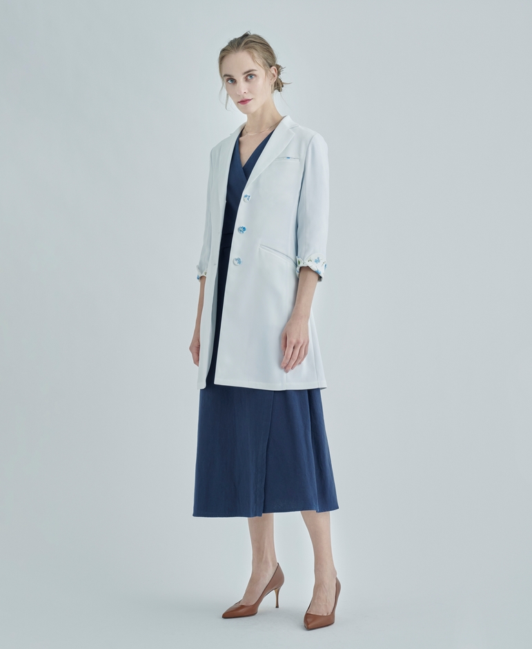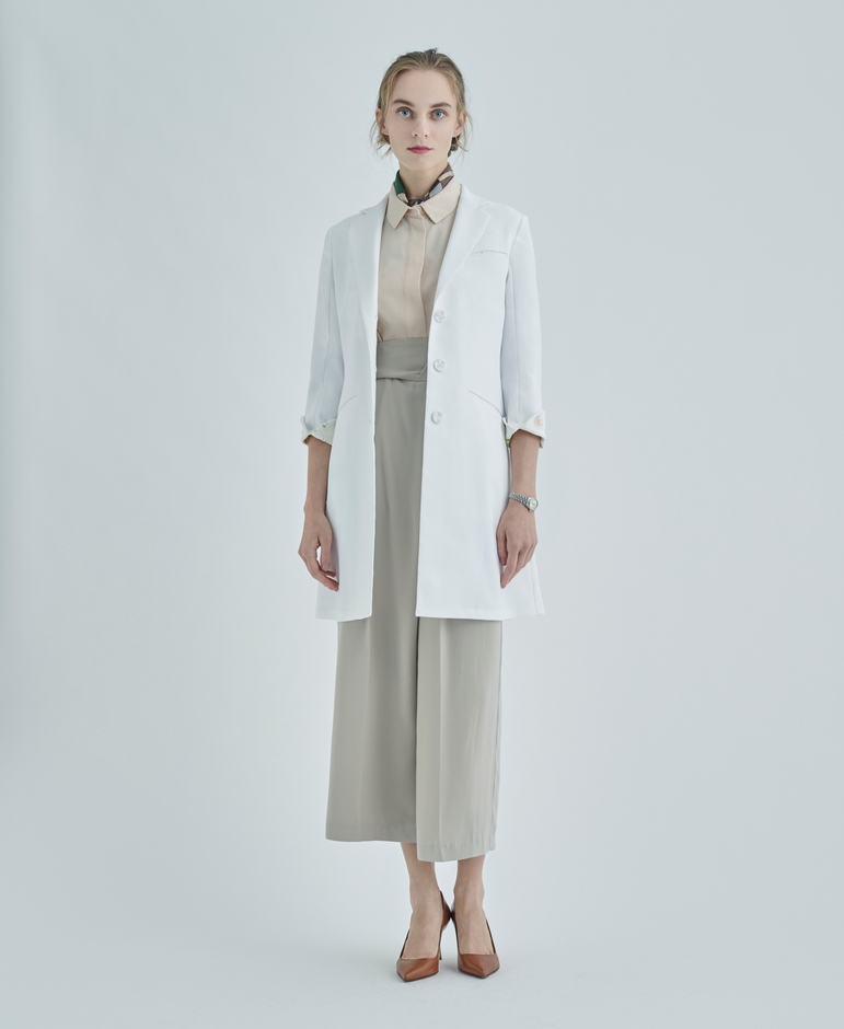 「オーソドックスで包容力のあるシルエットは、パステルカラーやシフォンなどの女性らしいアイテムとも好相性。白衣でもミックスマッチが叶う。肉厚なドクターコートと、柔らかな素材とのコーディネートでソフトで優しい印象へ。」