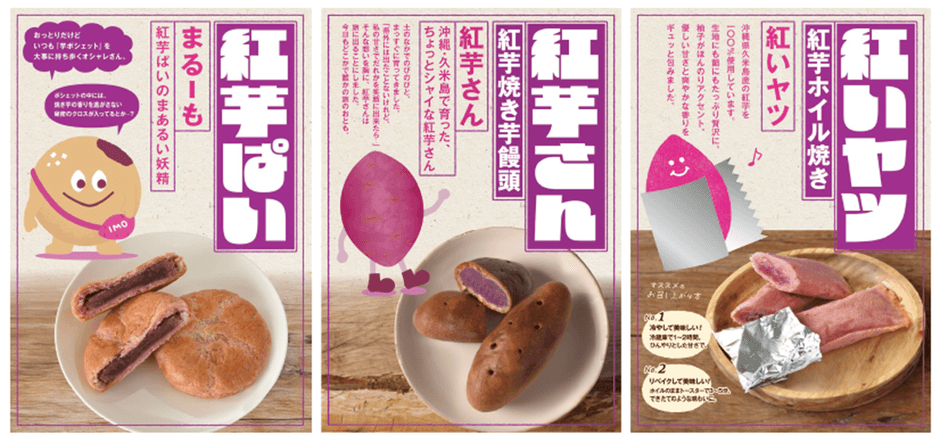 それぞれの紅芋スイーツには個性豊かなキャラクターやストーリーが込められており、来店されるお客様に“親しみ”と“楽しさ”を感じていただける売り場展開を目指します。