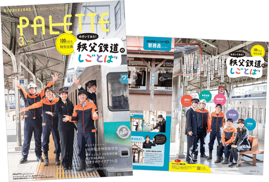 2017年11月号からはじまったPALETTEは今号で100号を迎えます。このことを記念し、特別企画として、鉄道の現場の第一線で働く5名の従業員とそのお仕事内容を特集します。秩父鉄道で働いているからこそ知っている駅や沿線の見どころのほか、おすすめの飲食店なども従業員の視点で紹介します。秩父鉄道の日常を支える従業員を身近に感じていただき、秩父鉄道でのお出かけを一層お楽しみいただけるよう企画しました。YouTubeとの連動企画として、PALETTEに登場する従業員のお仕事密着動画も公開します。